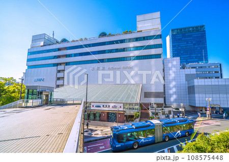 日本の横浜都市景観 横浜駅前(東口)を走る国産初の連節バス・ベイサイドブルーなどを望む