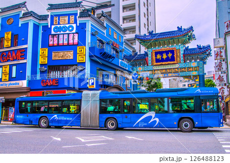 日本の横浜都市景観 5月。中華街入口バス停留所のヨコハマベイサイドブルーなどを望む=22日