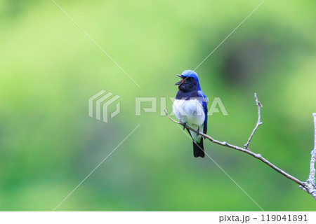 新緑の中、梢のてっぺんのソングスポットで大きく美しい声でさえずる美しいオオルリ(ヒタキ科)2024