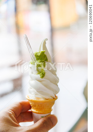 天城名物のわさびをたっぷりと乗せた、わさびソフトクリーム。 幹線道路沿いにある道の駅「天城越え」。
