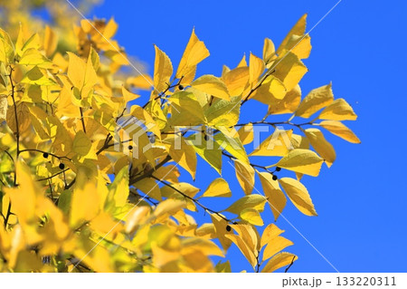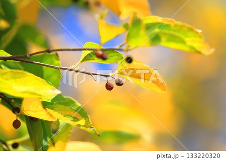 紅葉した榎(エノキ)と果実