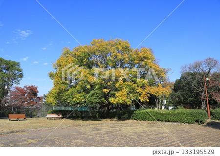 紅葉したて実をつけた榎(エノキ)の大木