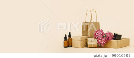 Fall Gift or Sale essential oil or face serum cosmetics concept. Shopping paper bag, with aster flowers. autumn decor. Copy space. Thanksgiving. Packaging. Box delivery