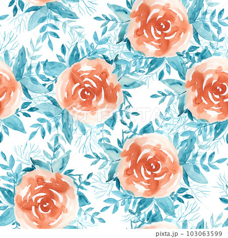 Beautiful watercolor floral seamless pattern of orange roses with bright turquoise blue leaves. Delicate contrast painting flowers texture for textile, wallpaper, wrapping paper, surface design