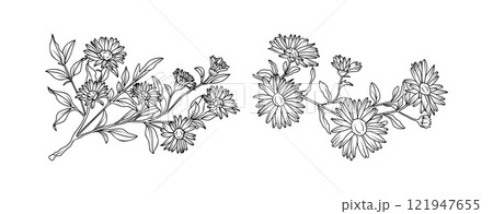 Aster flower arrangement line art on white background. Silhouette botanical hand drawn element for wedding, invitation frame design, vector illustration