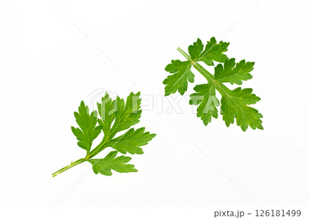 白背景にフレッシュな蓬の葉、よもぎ、餅草、ヨモギの葉の切り抜き素材、薬草