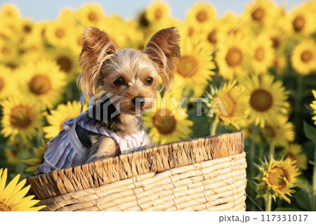 ひまわり畑とカゴに入って微笑むヨークシャテリア