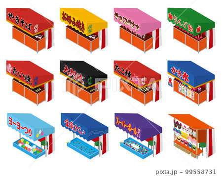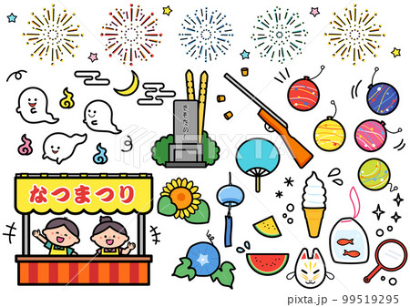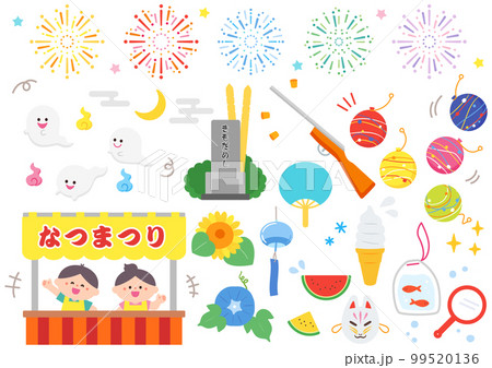 日本の夏祭りの縁日イラストセット 納涼 夏休み お盆休み フード ごはん 飲食物 イベント アイコン