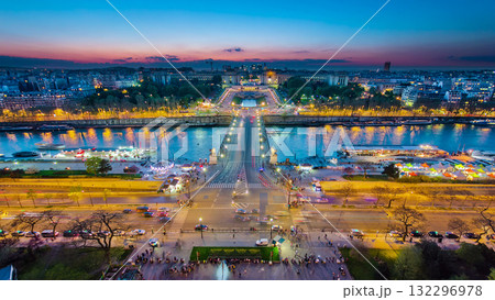 Aerial view of river Seine, Trocadero and La Defense from the Eiffel tower. Day to night timelapse. Paris, France, Europe.