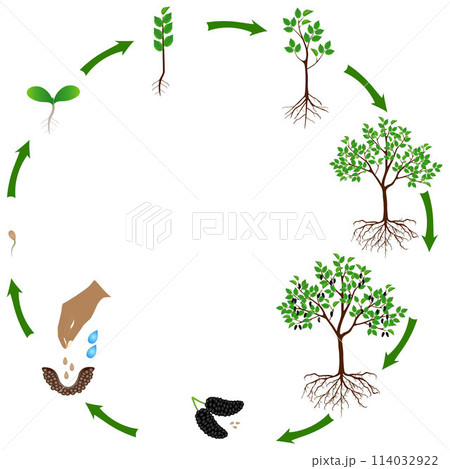 Life cycle of a mulberry plant on a white background.