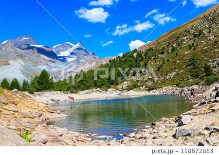 View of Grunsee lake (Green Lake) and the Swiss Alps at summer on the Five Lakes Trail in Zermatt, Switzerland