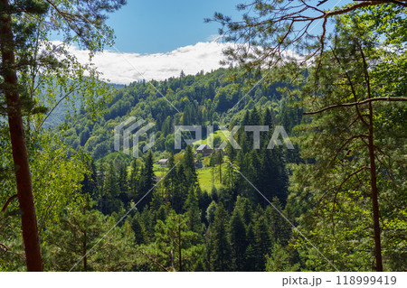 Beautiful landscape of village in valley among the mountains in summer day, Carpathians, Ukraine