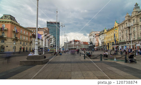 Central city square Trg bana Jelacica timelapse hyperlapse and Ban Jelacic monument in Zagreb, Croatia.