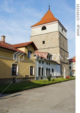 Colorful houses and bell tower in Zywiec city in Poland - vertical