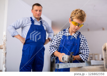 Boy in protective glasses cuts an aluminum profile with an angle grinder in room being renovated