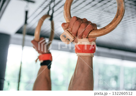Close up view of strong man that is using athlete rings