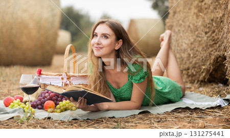 Young smiling sexy woman wearing in summer green dress lying down and reading book on soft mat near with stack of straw and enjoying romantic picnic
