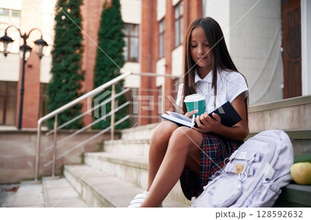 With backpack, sitting on the stairs. School girl in uniform is outdoors near the building