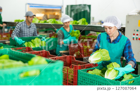 Female worker of vegetable sorting factory arranging lettuce in boxes