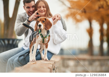 Smiling, having fun. Lovely couple are with their cute dog outdoors