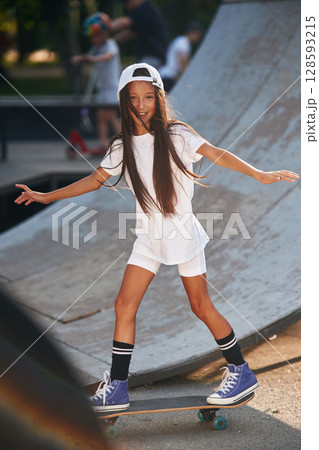 Riding skateboard near the ramp. Happy little girl with is outdoors