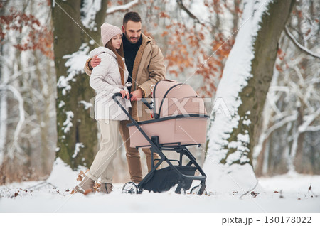 Mother and father with pram. Lovely couple have a walk in the winter forest