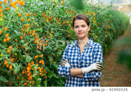 Portrait of successful farmer woman next to crop of ripe tomatoes in crates