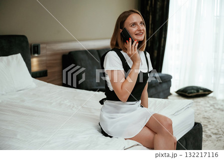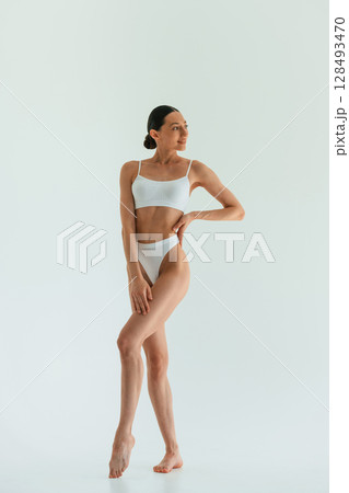 Against wall. Young caucasian woman with slim body shape is indoors in the studio