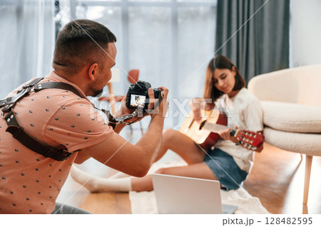 Photographer is working, using camera. Beautiful woman in casual clothes is at home with guitar