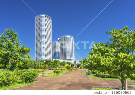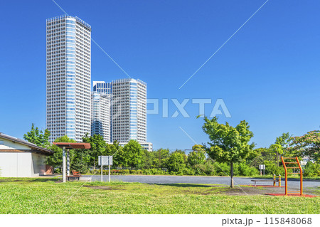 二子玉川公園の都市風景 緑豊かな公園とタワーマンション群【東京都・世田谷区】