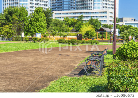 二子玉川公園の風景 藤棚のベンチと道の先に見えるタワーマンション群【東京都・世田谷区】
