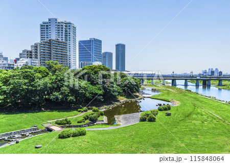 二子玉川・多摩川緑地の風景 緑豊かな河川敷とタワーマンション【東京都・世田谷区】