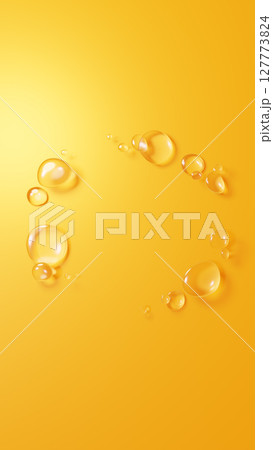 黄色背景に複数の水滴の背景素材。3D(縦長)