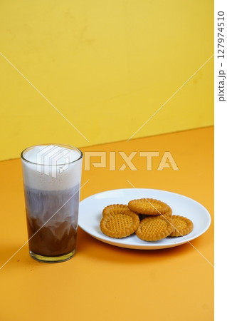 A refreshing glass of iced coffee with a foamy top and a plate of golden-brown biscuits, all against a vibrant orange backdrop.