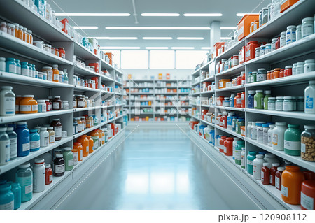 Pharmacy aisle with many bottles.