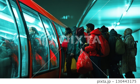 A vibrant scene of commuters waiting to board an orange transit vehicle. The atmosphere is electric and bustling before a journey begins. Experience the energy of urban life. Generative AI
