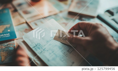 Hand holding ticket over travel itinerary.