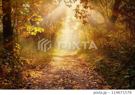 A serene forest where sunlight filters through ancient trees, illuminating a path of vibrant fallen leaves.