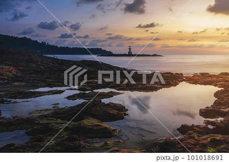 rocky coast on the beach in Khao Lak thailand , evening beautiful magical sunset lighthouse on the horizon , beautiful landscape photography