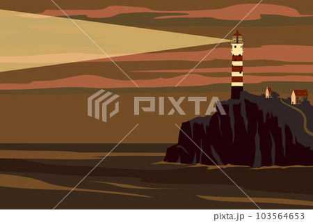 Scenic landscape of a sea shore with lighthouse at night. Marine horizon with clouds landscape background.