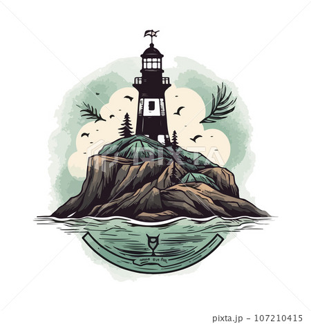 Lighthouse in the ocean on the small rocky island vector logo emblem. Lighthouse tower mascot