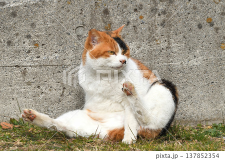 壁にもたれてスコ座りする三毛猫