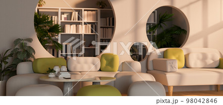 Modern colorful trendy co-working space or reading room interior design with comfortable couch