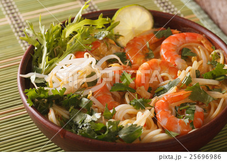 Malaysian laksa soup with prawns close up