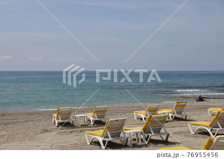 Empty sun loungers on a sandy beach against the background of the sea and waves, preparation for the beach season, mood, sea background, Alanya, April 2021