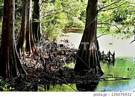 愛知県森林公園の溜池岩本池風景 ラクウショウの気根
