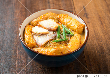 Delicious curry mee or curry laksa with roast pork and fresh raw cockerel