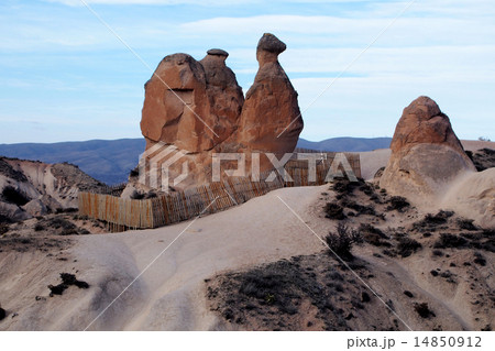 ウチヒサールの岩山とラクダ カッパドキア 世界遺産 トルコ アジア