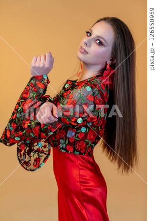 This is an Elegant Fashion Portrait featuring Vibrant Colors and Intricate Floral Patterns
