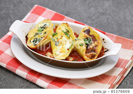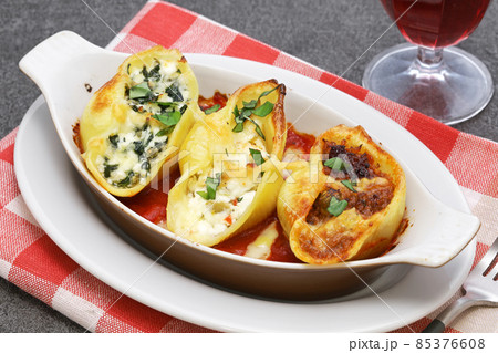 コンキリオーニの詰め物オーブン焼き3種(ほうれん草、リコッタチーズ、ミートソース)